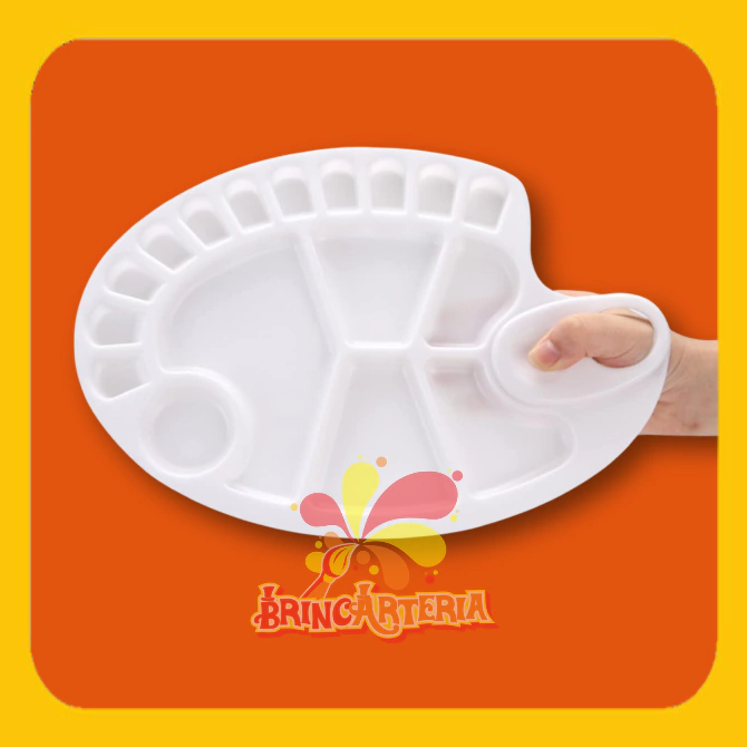Godê em anatomia de paleta com 17 cavidades para a mistura e armazenamento momentâneo de tintas líquidas, pastosas e cremosas. Material plástico branco. Dimensões: 30x20x2cm