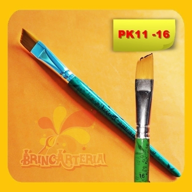 Pincel Keramik Angular ou Chanfrado. Seu formato irregular permite o preenchimento de desenhos, coberturas e diferentes efeitos especiais à pintura. Na Maquiagem Artística/Pintura Facial esse tipo de pincel é utilizado para uma infinidade de ideias, como design de folhagens, flores, traços começando largos e terminando finos, entre outras técnicas.