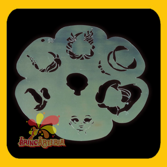 Molde vazado, também conhecido como Stencil, ideal para compor pinturas de princesas. De material flexível, lavável e no tamanho adequado para ser utilizado no trabalho de pintura corporal e facial.