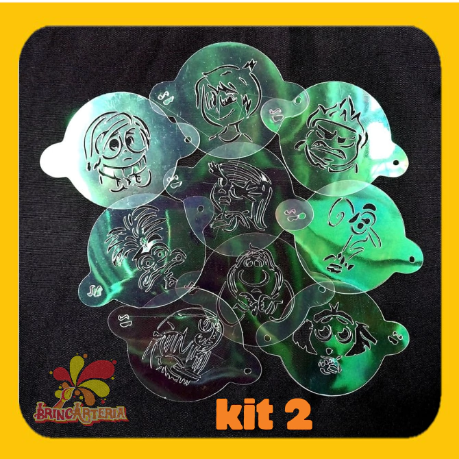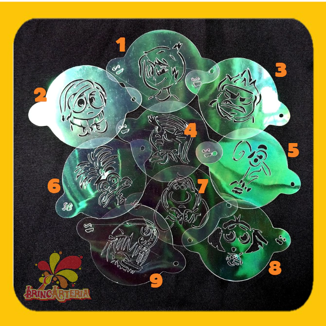 Stencils no tema do filme DIVERTIDAMENTE, para Pintura Facial e Corporal, Tattoo-Glítter, Tattoo-Fake ou Tattoo temporária. De material flexível, lavável e no tamanho adequado para ser utilizado no trabalho de Maquiagem Artística/Pintura Facial.